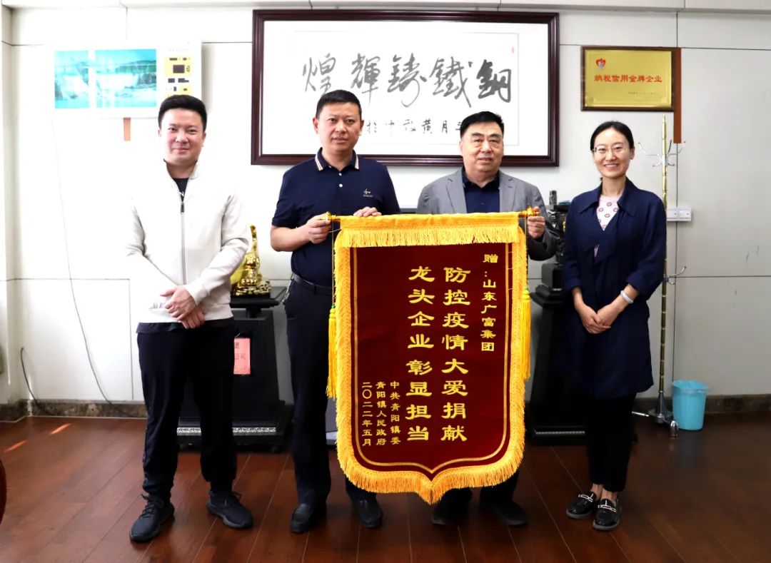 5月2日,鄒平市青陽鎮黨委書記李波,鎮黨委副書記、鎮長于淼來到我公司將寫有“防控疫情大愛捐獻 龍頭企業彰顯擔當”的錦旗贈送到老板手中,并對我公司疫情期間守望相助的大愛情懷表達了誠摯的感謝。