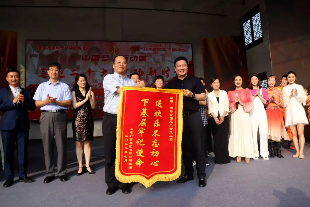 “我們永遠(yuǎn)跟黨走,幸福日子就在眼前......”6月30日下午,為大力弘揚(yáng)勞模精神、勞動(dòng)精神、工匠精神和企業(yè)家精神,為“大干三十天,努力走在前”擂鼓加油,七一之際,中華全國總工會(huì)文工團(tuán)“中國夢·勞動(dòng)美——喜迎二十大 建功新時(shí)代”慰問演出活動(dòng)走進(jìn)青陽鎮(zhèn),中華全國總工會(huì)文工團(tuán)黨委書記、團(tuán)長錢磊 , 濱州市總工會(huì)黨組書記、分管日常工作的副主席李殿祥,濱州市總工會(huì)黨組成員、副主席由偉,濱州市總工會(huì)女工委主任蔡洪霞, 濱州市總工會(huì)宣教部負(fù)責(zé)人李花英,鄒平市委組織部部長劉德軍,鄒平市總工會(huì)黨組書記、副主席王萌,青陽鎮(zhèn)黨委書記李波,我公司總經(jīng)理張廣富,董事長張向海參加。